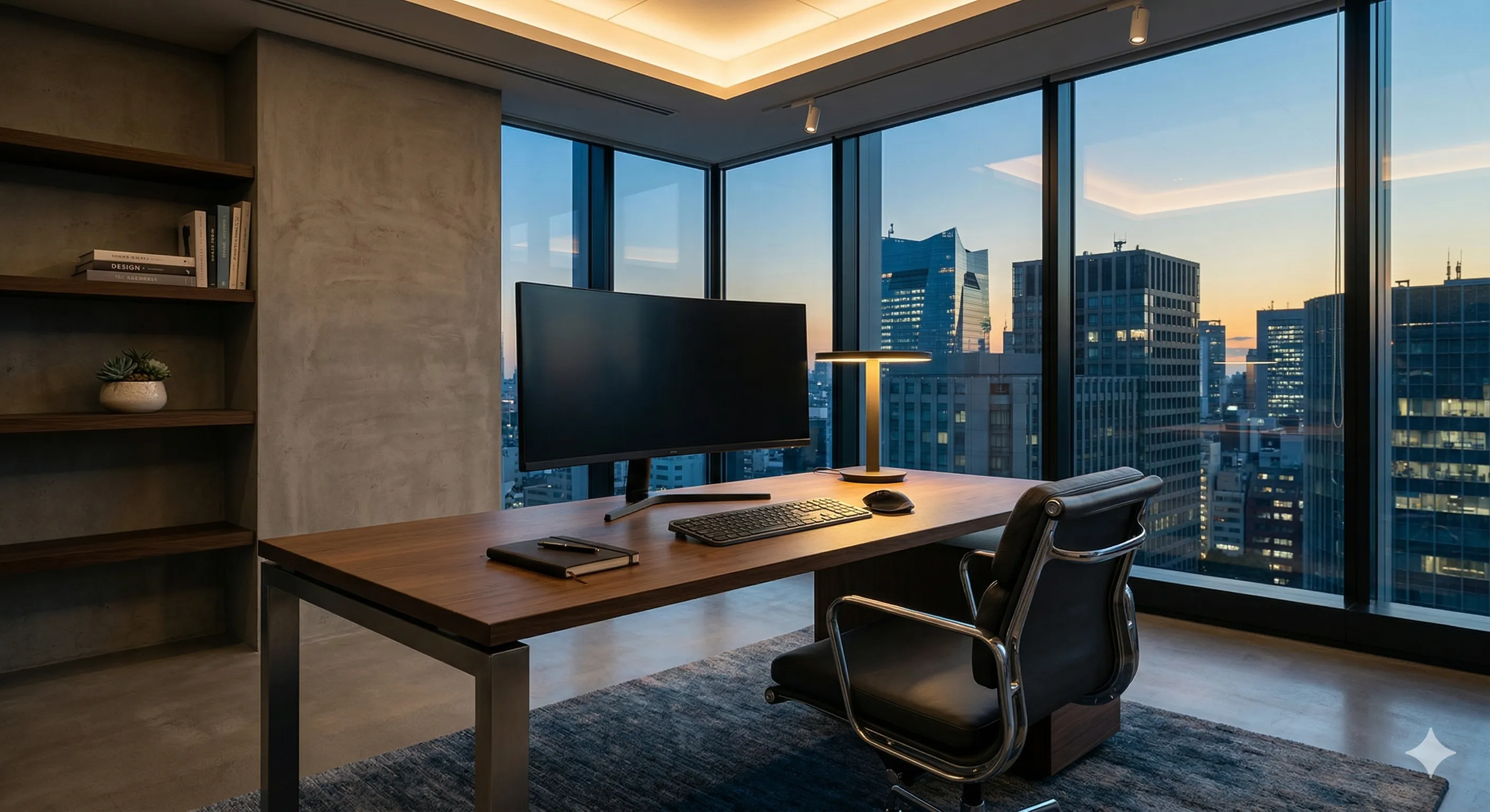 暗色の背景にゴールドのアクセントカラーを配した大型のファーストビュー。